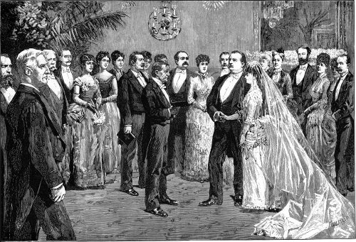 "The President's Wedding" from Harper's Weekly, Thulstrup, artist. The ceremony was performed in the Blue Room of the White House, June 2, 1886.